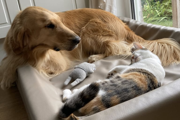 Bei uns wohnt auch noch eine Katze. Die ist in Ordnung, kapiert aber in der Regel nicht, was ich von ihr will. Außerdem jagt sie furchtbar gerne meinen Schwanz, was ich dann nicht so witzig finde! Andere Hunde gibt es bei uns in der Nachbarschaft jede Menge. Die meisten sind lieb, aber manche sind auch echt unfreundlich! Denen gehe ich dann aus dem Weg oder ich bleibe einfach ganz dicht bei Frauchen. Auf Kämpfe habe ich nämlich überhaupt keine Lust!